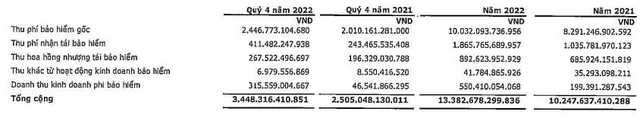 Trong đó, thu phí bảo hiểm gốc chiếm tỷ trọng lớn nhất (71%) mang về 2.447 tỷ đồng, tăng gần 22% so với cùng kỳ. Thu phí nhận tái bảo hiểm và thu hoa hồng nhượng tái bảo hiểm lần lượt đóng góp 411,5 tỷ đồng và 267,5 tỷ đồng, tương ứng tăng 69% và 36% so với quý 4/2021. Đáng chú ý, doanh thu kinh doanh phi bảo hiểm tăng đột biến gấp 6,8 lần cùng kỳ, lên đạt 315,6 tỷ đồng.