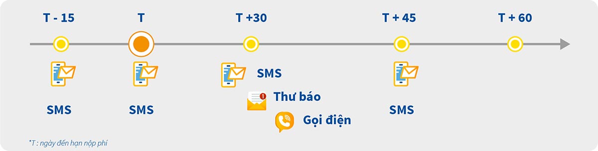 Để giúp khách hàng cập nhật kịp thời thông tin phí Bảo hiểm đến hạn, các thông báo/nhắc phí được gửi đến khách hàng theo trình tự thời gian sau: